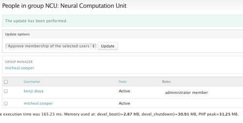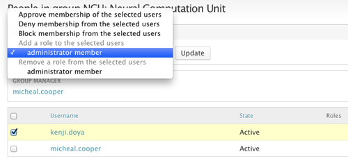 All group website members are determined by LDAP. When someone logs into groups.oist.jp, they are added to each group that is listed in their LDAP records. If the group member does not appear on the Tab Menu > Group > People page, first make sure that she has logged into groups.oist.jp. If she is still not visible in the list, contact IT at info-sys@oist.jp. A user must be a member and appear in the list of group members before you can give her administrative privileges.